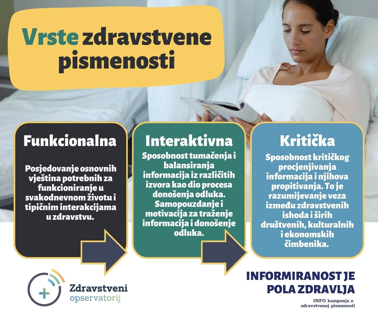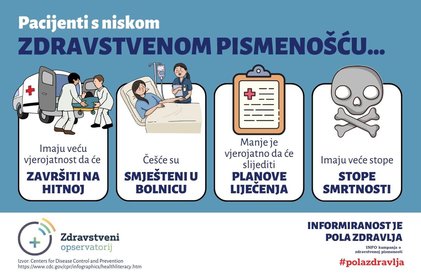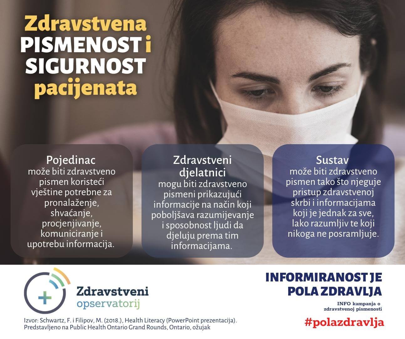 Zdravstvena pismenost je sposobnost pojedinaca da pronađu, razumiju i koriste informacije i usluge, kako bi donosili i poduzimali informirane odluke i radnje za zdravlje sebe i drugih. Istraživanje na nacionalno reprezentativnom uzorku, provedeno u sklopu ovoga projekta, pokazalo je da je razina zdravstvene pismenosti hrvatskih građana u prosjeku na samoj granici između problematične i adekvatne, a najviše problema imaju s pronalaskom, razumijevanjem i upotrebom informacija o zdravlju.
