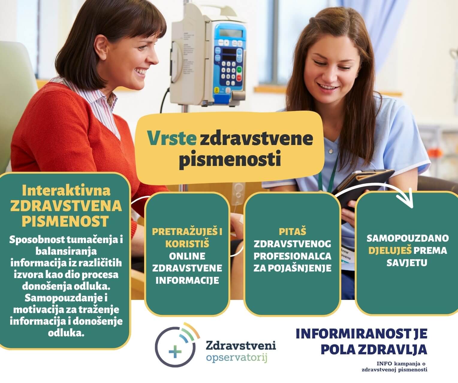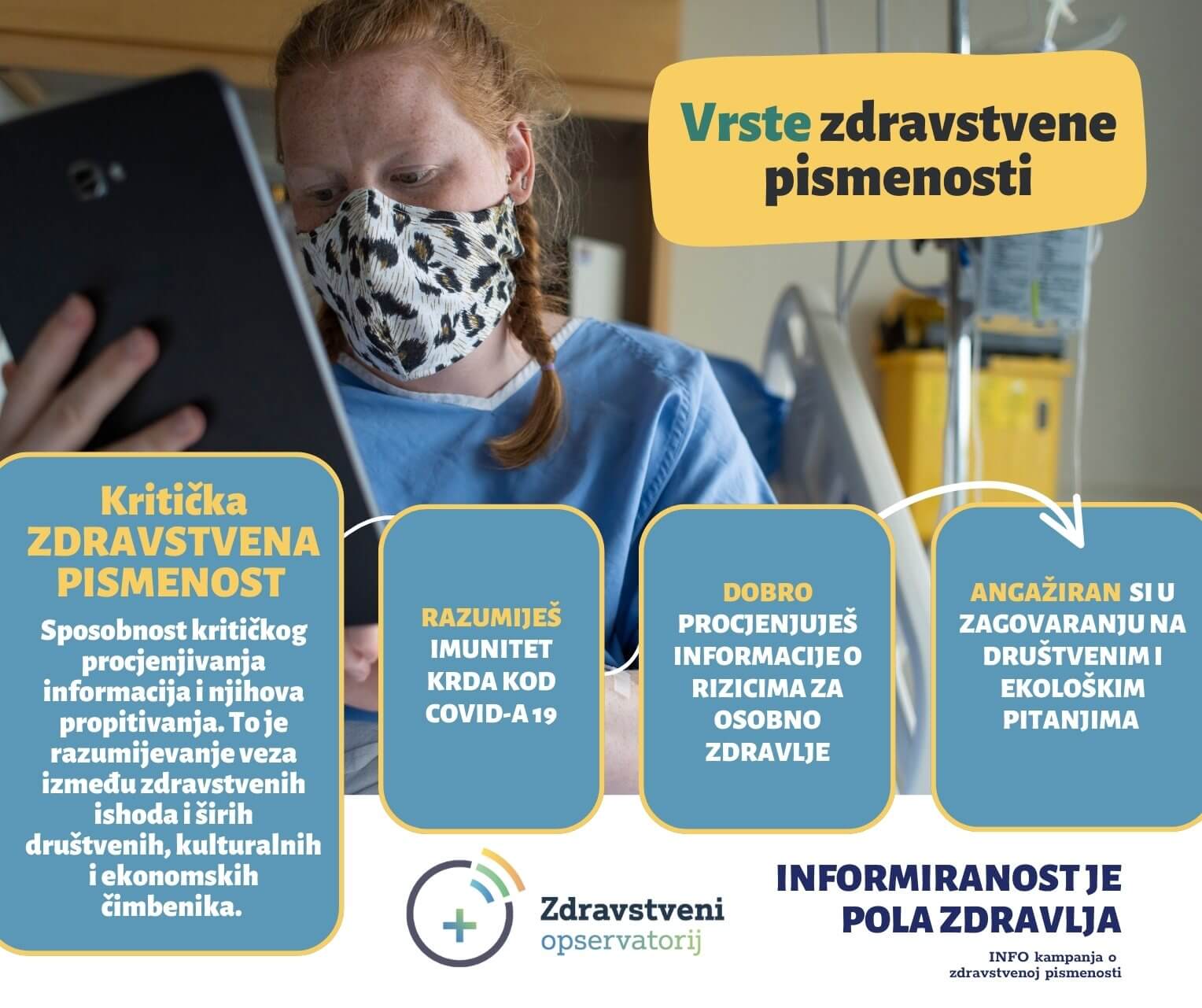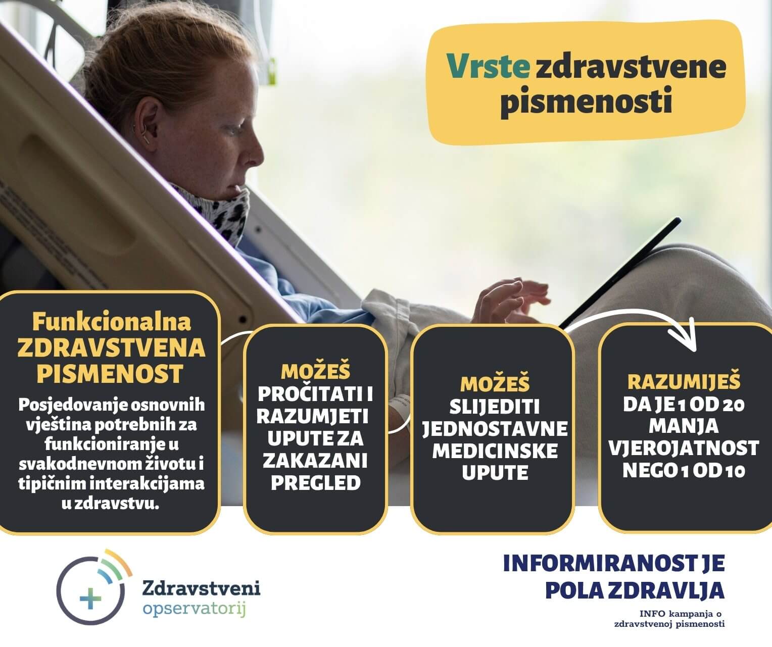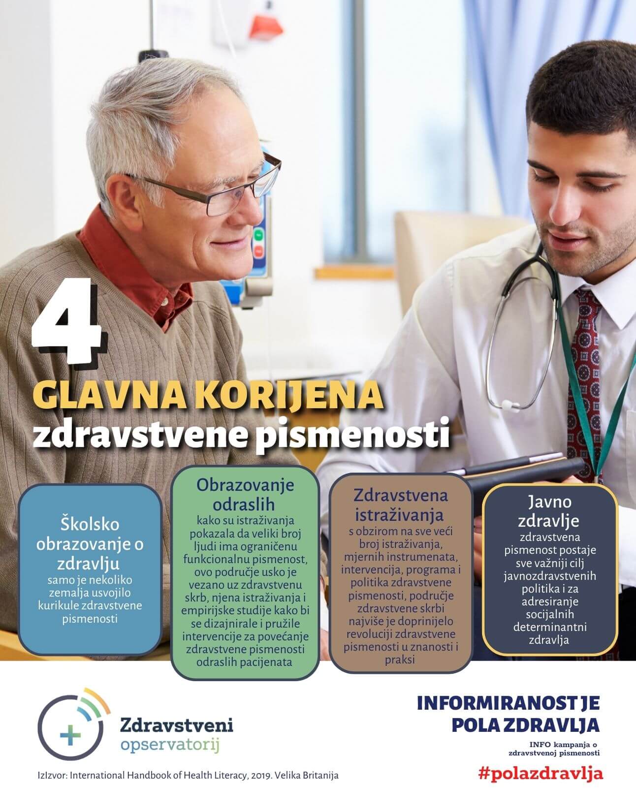 Zdravstvena pismenost je sposobnost pojedinaca da pronađu, razumiju i koriste informacije i usluge, kako bi donosili i poduzimali informirane odluke i radnje za zdravlje sebe i drugih. Istraživanje na nacionalno reprezentativnom uzorku, provedeno u sklopu ovoga projekta, pokazalo je da je razina zdravstvene pismenosti hrvatskih građana u prosjeku na samoj granici između problematične i adekvatne, a najviše problema imaju s pronalaskom, razumijevanjem i upotrebom informacija o zdravlju.